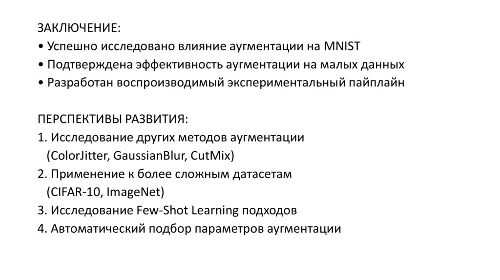 ЗАКЛЮЧЕНИЕ:• Успешно исследовано влияние аугментации на MNIST