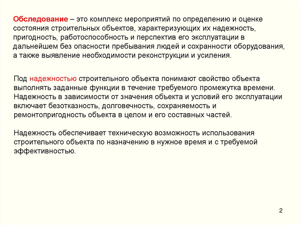 Обследование – это комплекс мероприятий по определению и оценкесостояния строительных объектов, характеризующих их надежность,