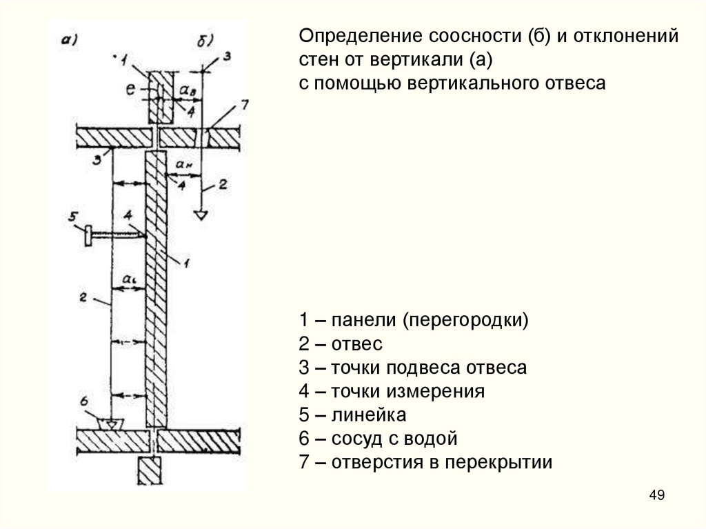 Определение соосности (б) и отклоненийстен от вертикали (а)