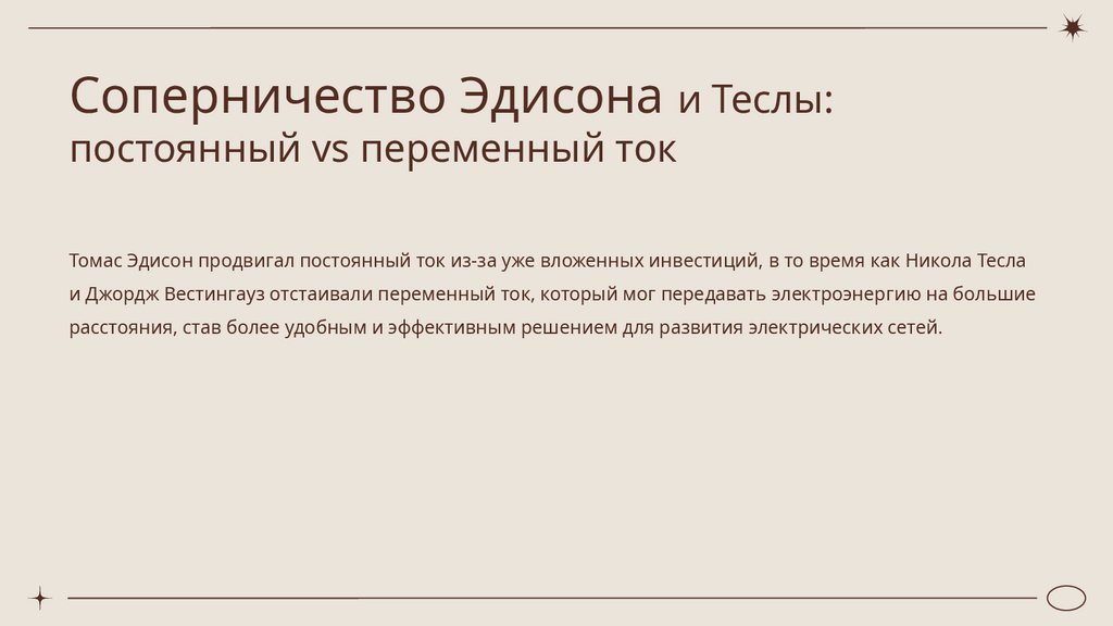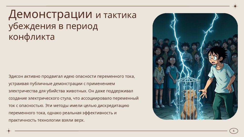 Томас Эдисон продвигал постоянный ток из-за уже вложенных инвестиций, в то время как Никола Тесла