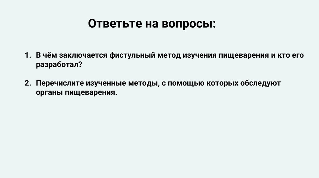 Ответьте на вопросы:1. В чём заключается фистульный метод изучения пищеварения и кто его