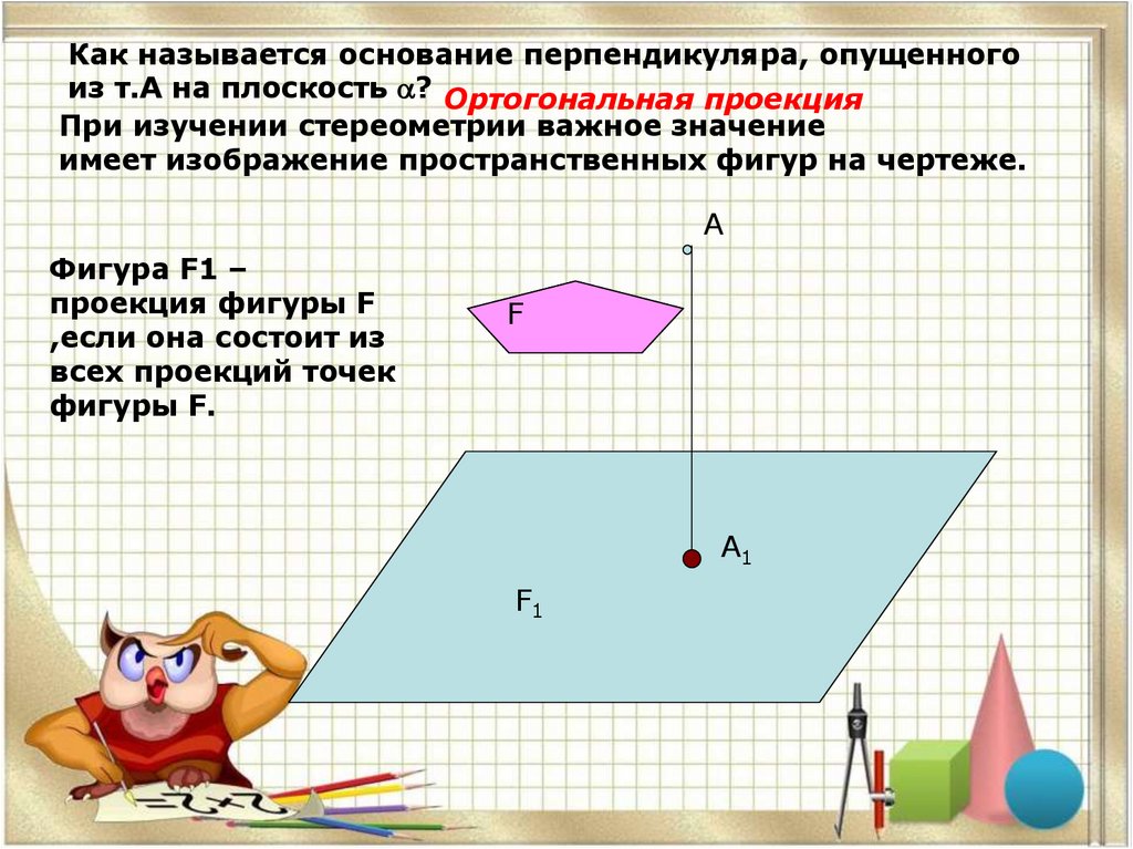 Как называется основание перпендикуляра, опущенногоиз т.А на плоскость ? Ортогональная проекция