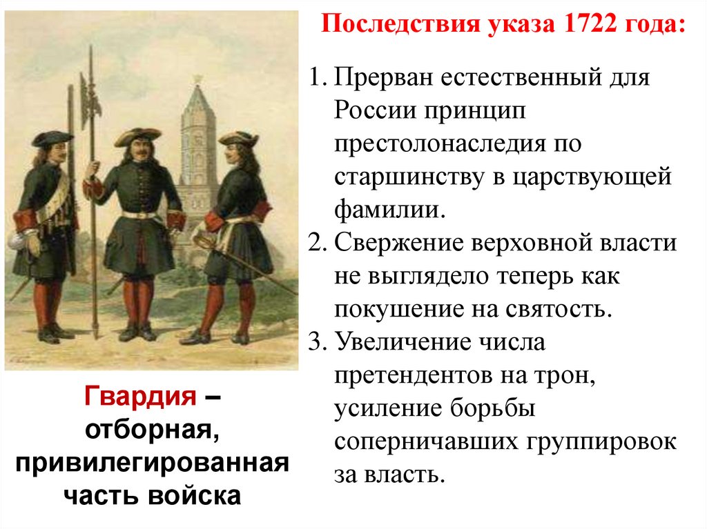 - Высокая роль гвардии при дворе.