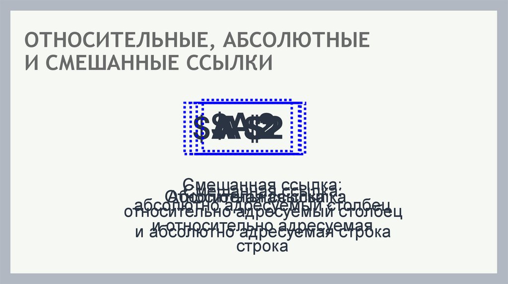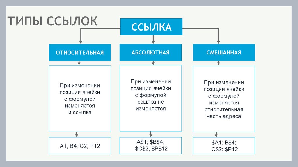 Различают относительные, абсолютные и смешанные ссылки. Ссылка, которая