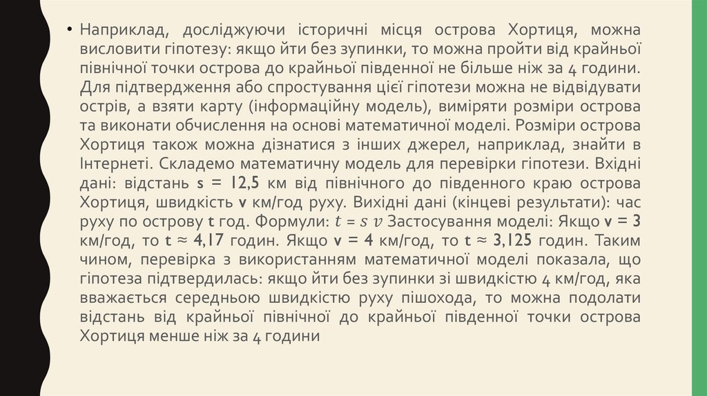 • Наприклад, досліджуючи історичні місця острова Хортиця, можнависловити гіпотезу: якщо йти без зупинки, то можна пройти від крайньої