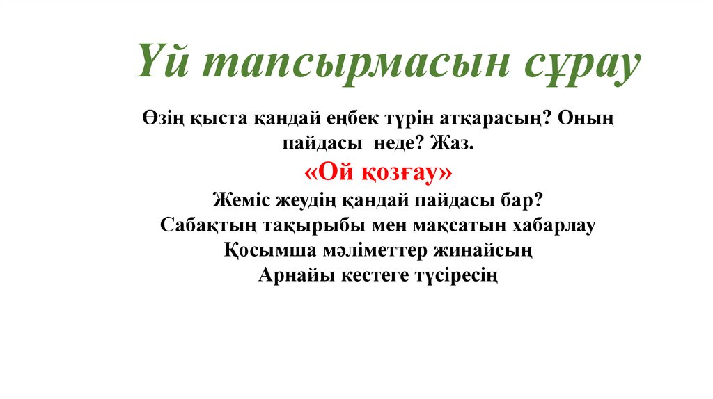 Үй тапсырмасын сұрауӨзің қыста қандай еңбек түрін атқарасың? Оның