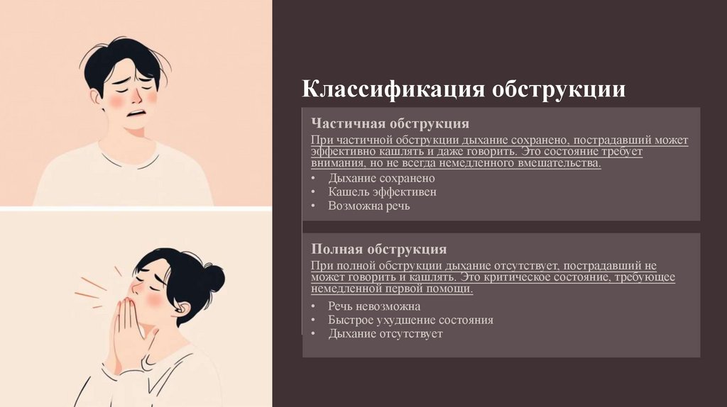 При частичной обструкции дыхание сохранено, пострадавший может