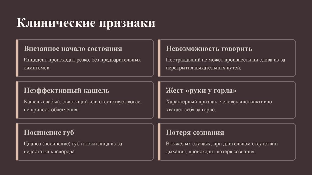 При полной обструкции дыхание отсутствует, пострадавший не