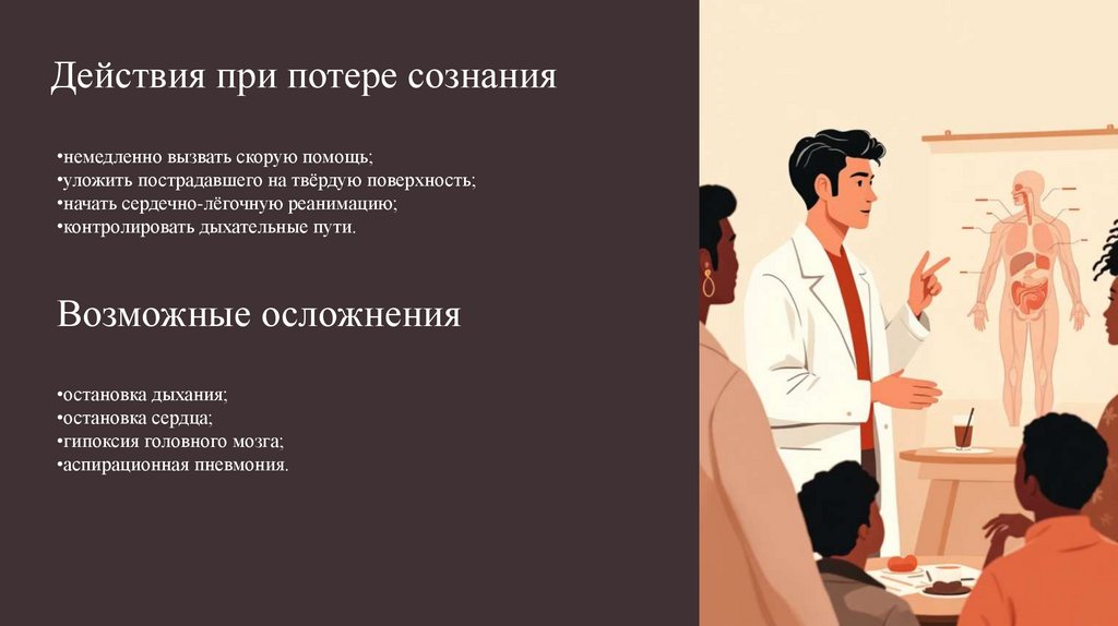 Действия при потере сознания•немедленно вызвать скорую помощь;