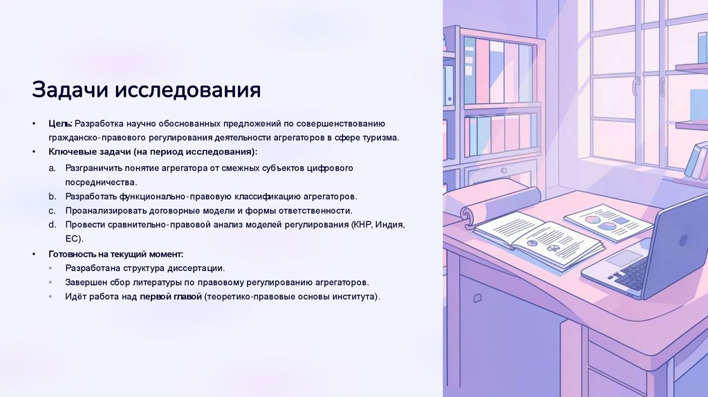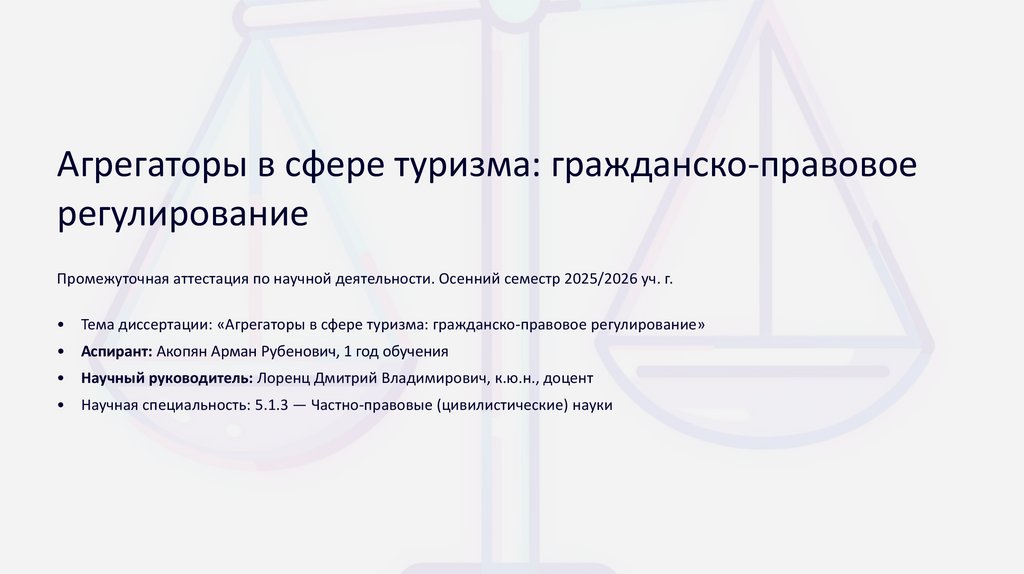 • Тема диссертации: «Агрегаторы в сфере туризма: гражданско-правовое регулирование»