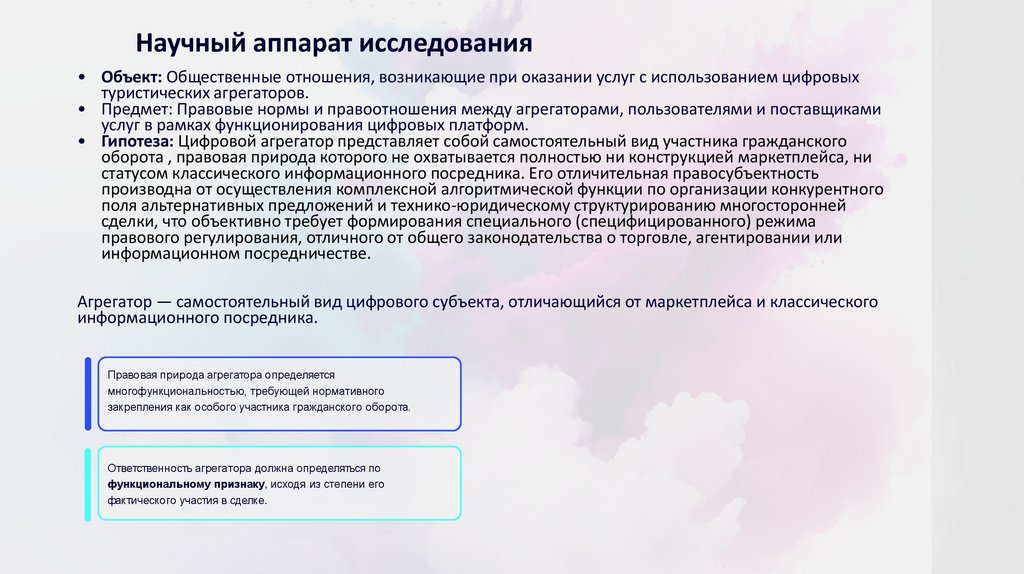 Научный аппарат исследования• Объект: Общественные отношения, возникающие при оказании услуг с использованием цифровых