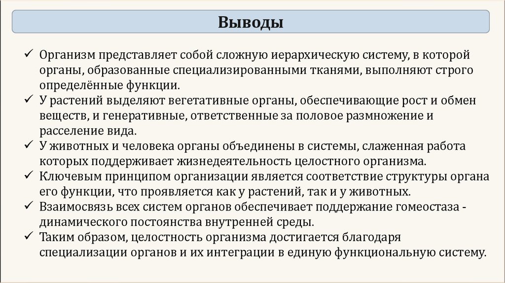 ВыводыОрганизм представляет собой сложную иерархическую систему, в которой