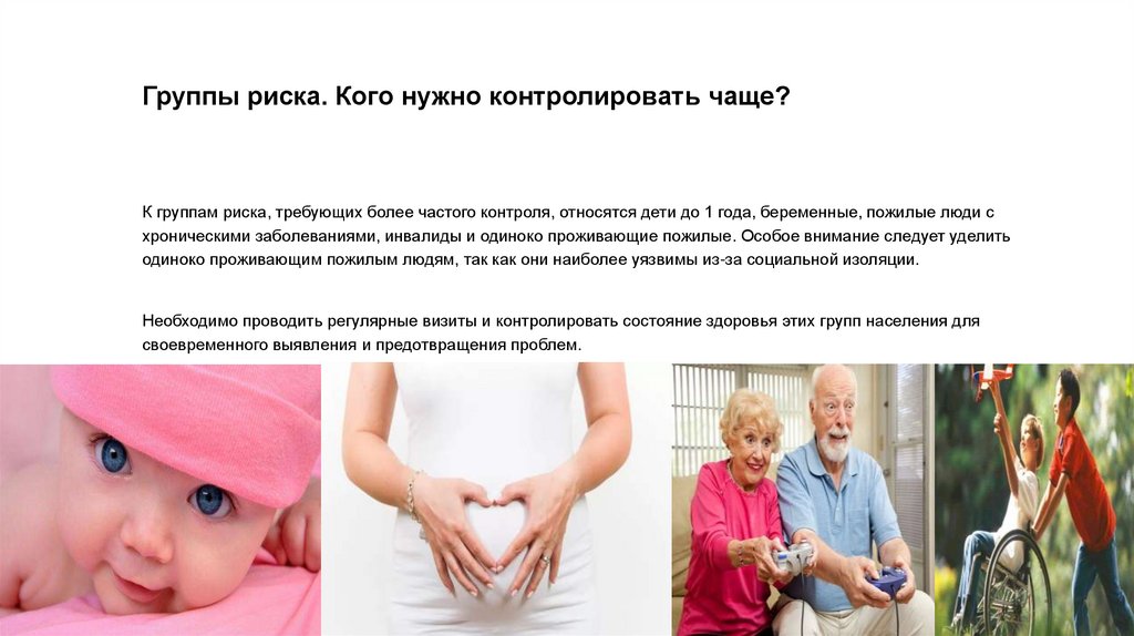 Группы риска. Кого нужно контролировать чаще?К группам риска, требующих более частого контроля, относятся дети до 1 года, беременные, пожилые люди с