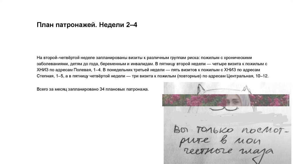 План патронажей. Недели 2–4На второй–четвёртой неделе запланированы визиты к различным группам риска: пожилым с хроническими