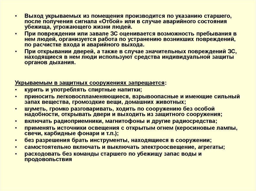Выход укрываемых из помещения производится по указанию старшего,