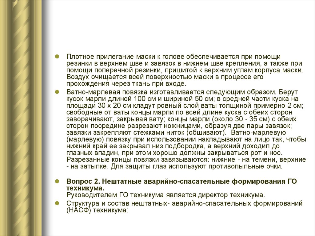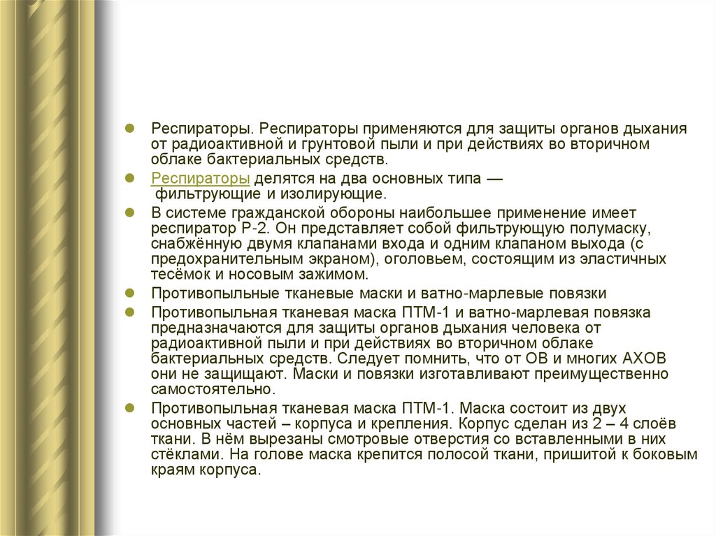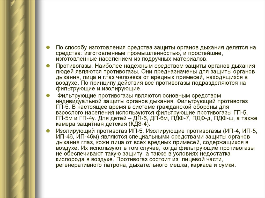 По способу изготовления средства защиты органов дыхания делятся насредства: изготовленные промышленностью, и простейшие,