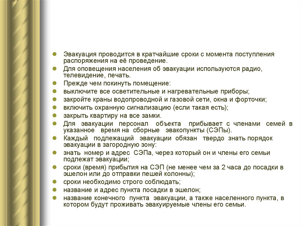 Эвакуация проводится в кратчайшие сроки с момента поступленияраспоряжения на её проведение.