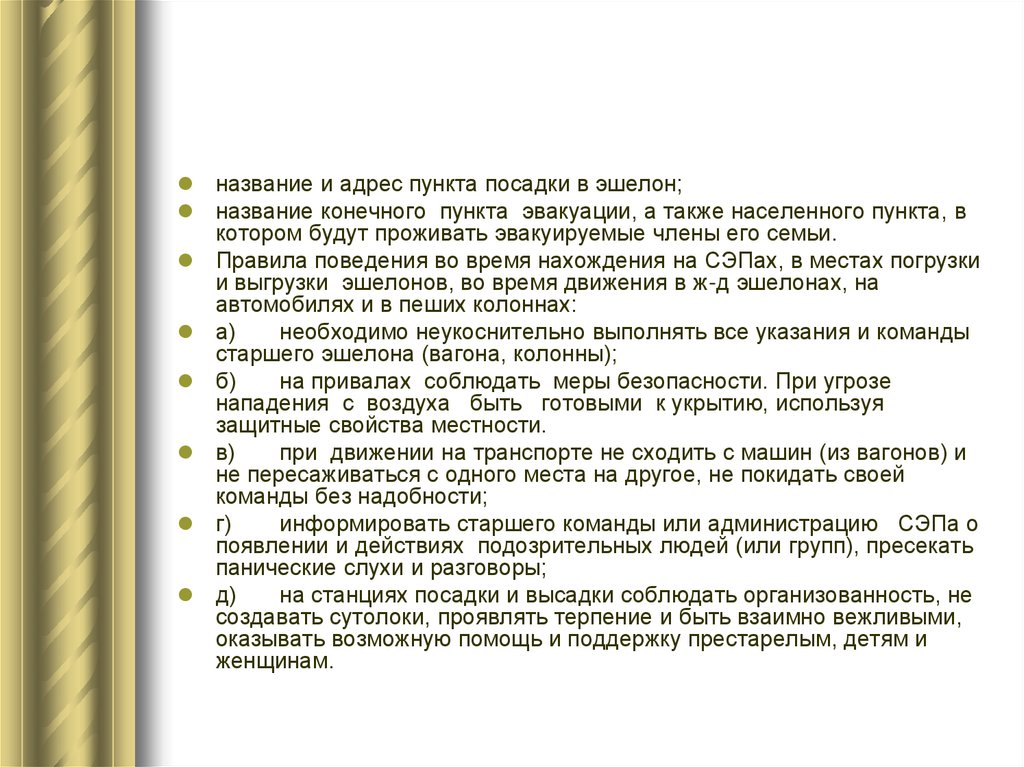 название и адрес пункта посадки в эшелон;название конечного пункта эвакуации, а также населенного пункта, в