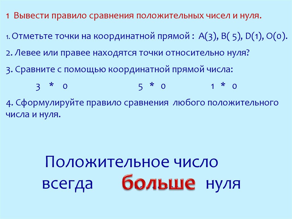 1 Вывести правило сравнения положительных чисел и нуля.1. Отметьте точки на координатной прямой : А(3), В( 5), D(1), O(0).