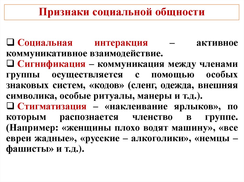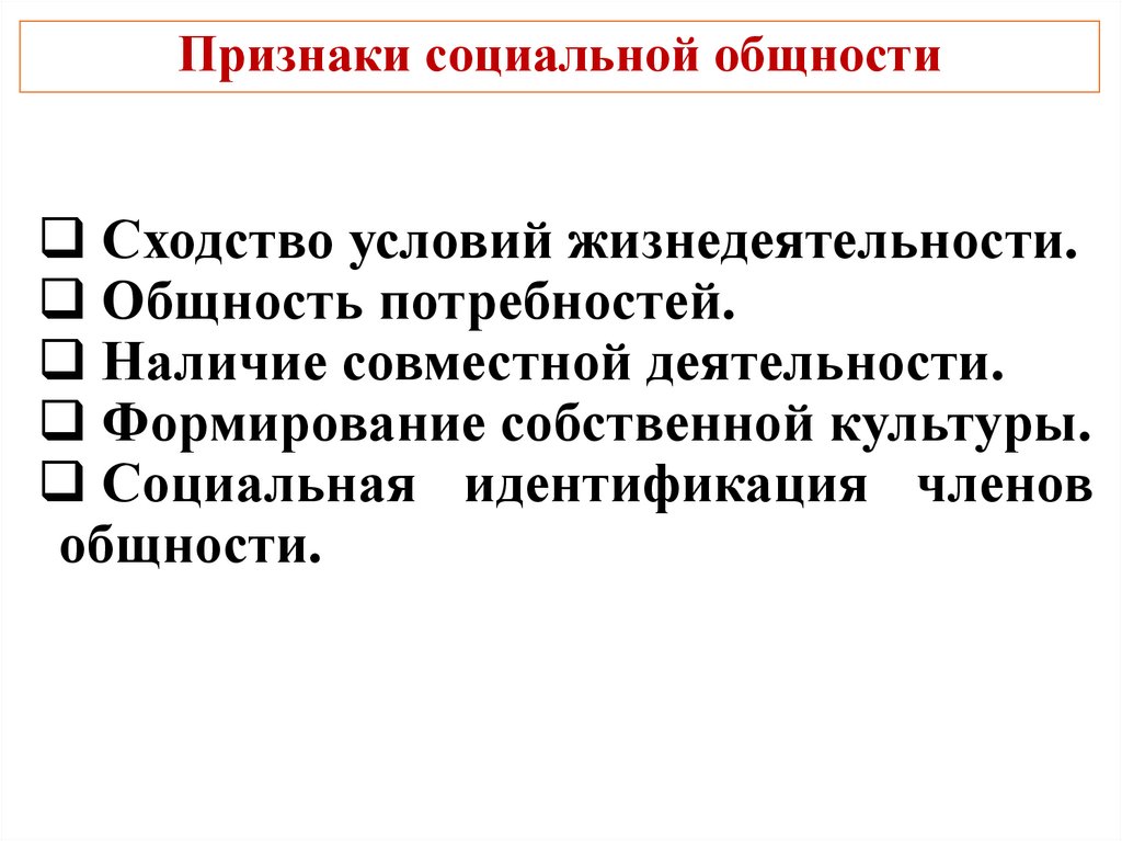 Признаки социальной общностиСходство условий жизнедеятельности.