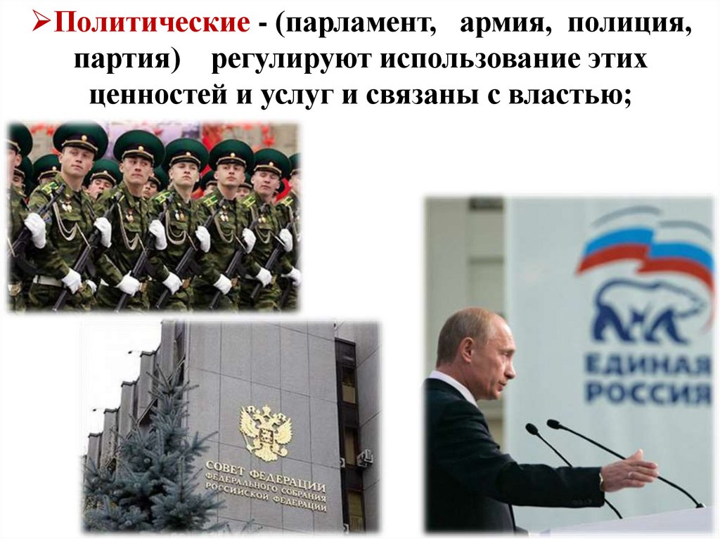 Политические - (парламент, армия, полиция,партия) регулируют использование этих
