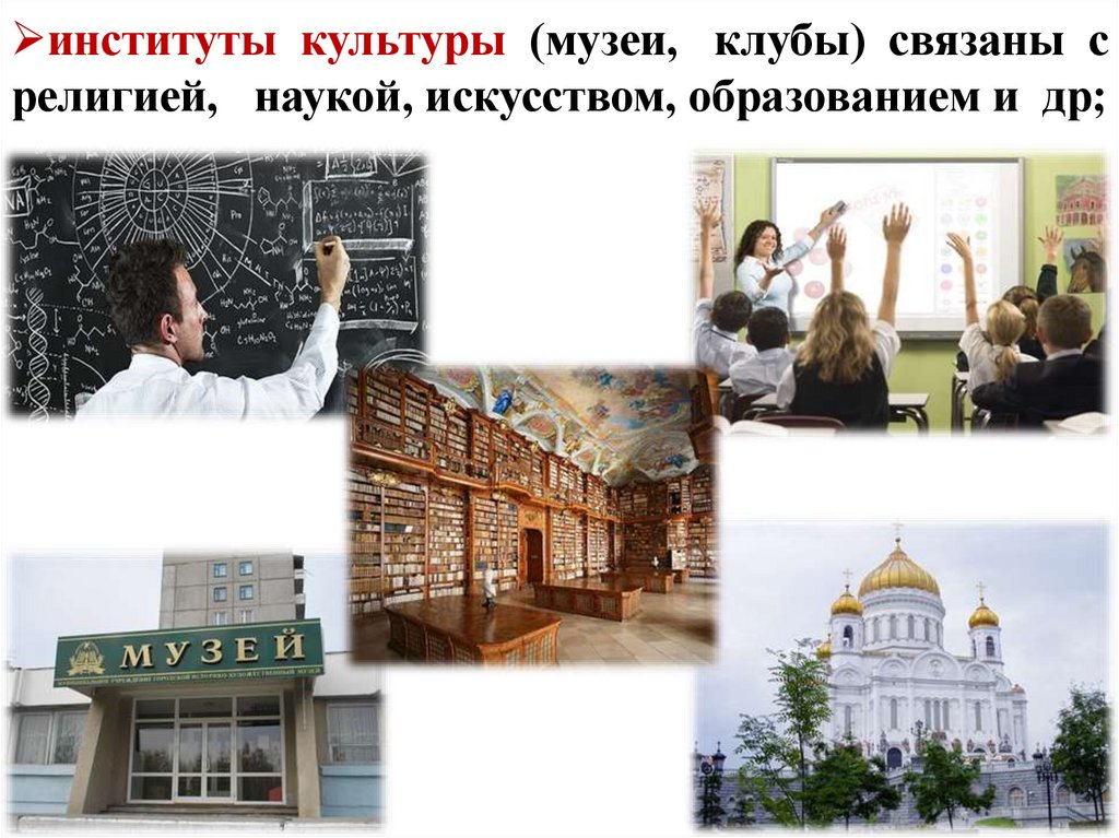 институты культуры (музеи, клубы) связаны срелигией, наукой, искусством, образованием и др;