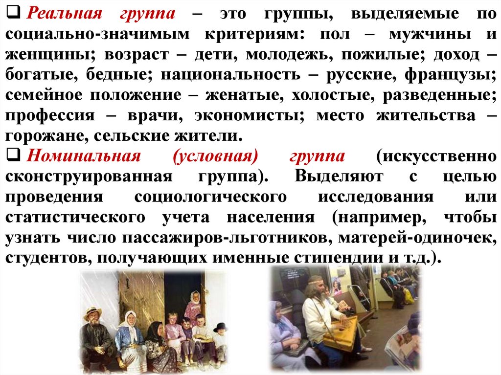 Реальная группа – это группы, выделяемые посоциально-значимым критериям: пол – мужчины и