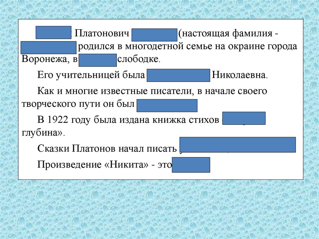 Андрей Платонович Платонов (настоящая фамилия Климентов) родился в многодетной семье на окраине городаВоронежа, в Ямской слободке.