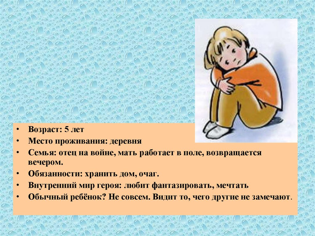 • Семья: отец на войне, мать работает в поле, возвращается
