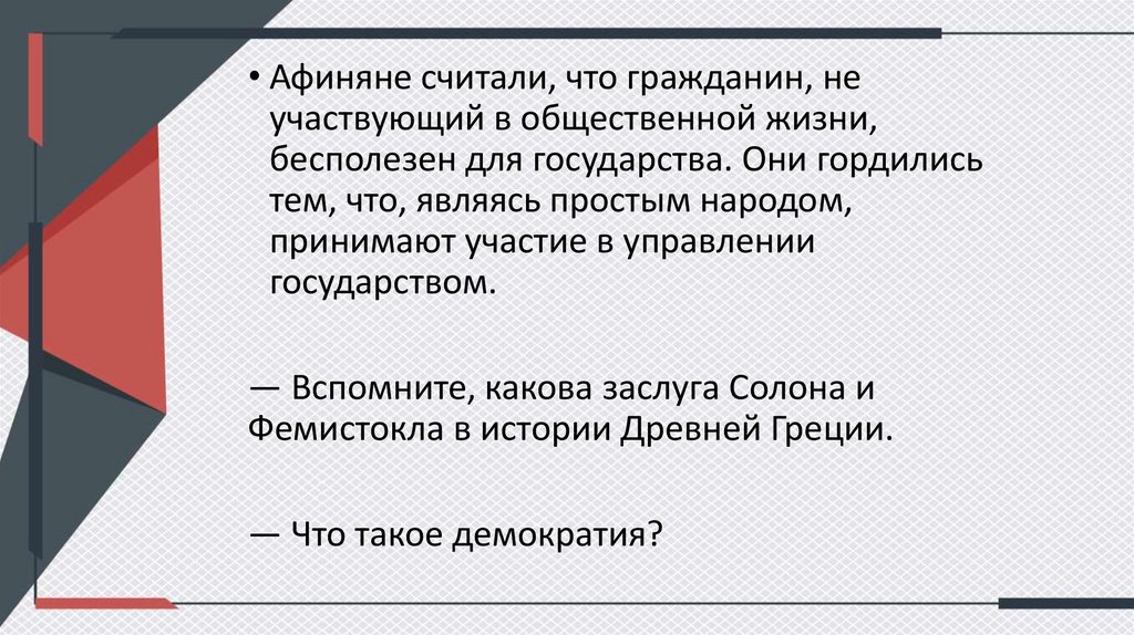 • Афиняне считали, что гражданин, неучаствующий в общественной жизни,