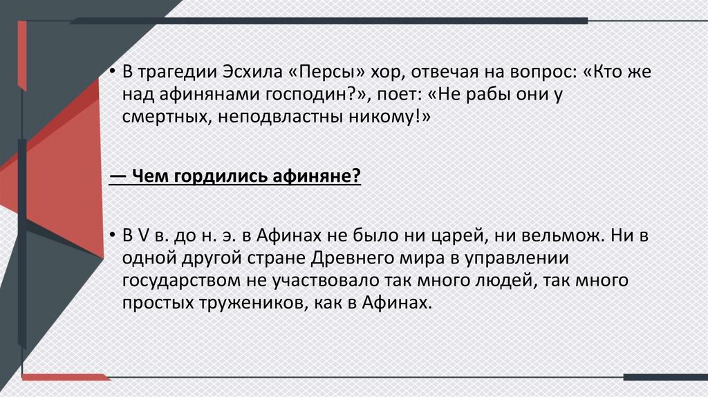 • В трагедии Эсхила «Персы» хор, отвечая на вопрос: «Кто женад афинянами господин?», поет: «Не рабы они у
