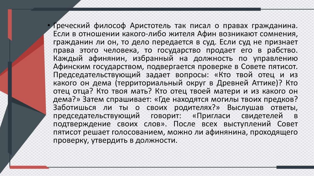 • Греческий философ Аристотель так писал о правах гражданина.Если в отношении какого-либо жителя Афин возникают сомнения,
