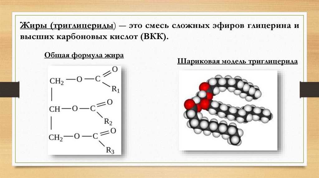Жиры (триглицериды) ― это смесь сложных эфиров глицерина ивысших карбоновых кислот (ВКК).