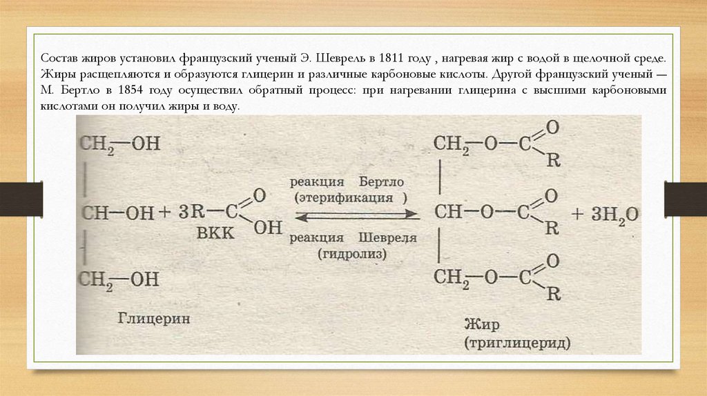 Состав жиров установил французский ученый Э. Шеврель в 1811 году , нагревая жир с водой в щелочной среде.Жиры расщепляются и образуются глицерин и различные карбоновые кислоты. Другой французский ученый ―