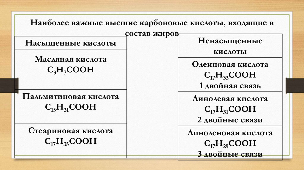 Наиболее важные высшие карбоновые кислоты, входящие всостав жиров