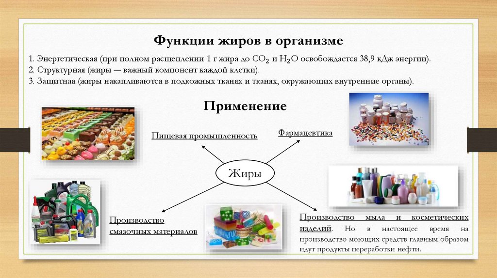 Функции жиров в организме1. Энергетическая (при полном расщеплении 1 г жира до CO2 и H2 O освобождается 38,9 кДж энергии).