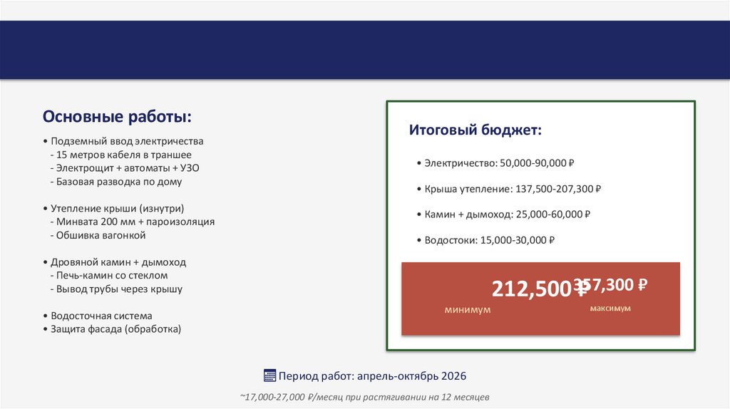 2026 год: Электричество + Крыша + КаминОсновные работы: