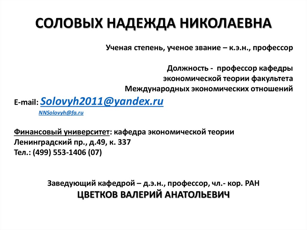 СОЛОВЫХ НАДЕЖДА НИКОЛАЕВНАУченая степень, ученое звание – к.э.н., профессор