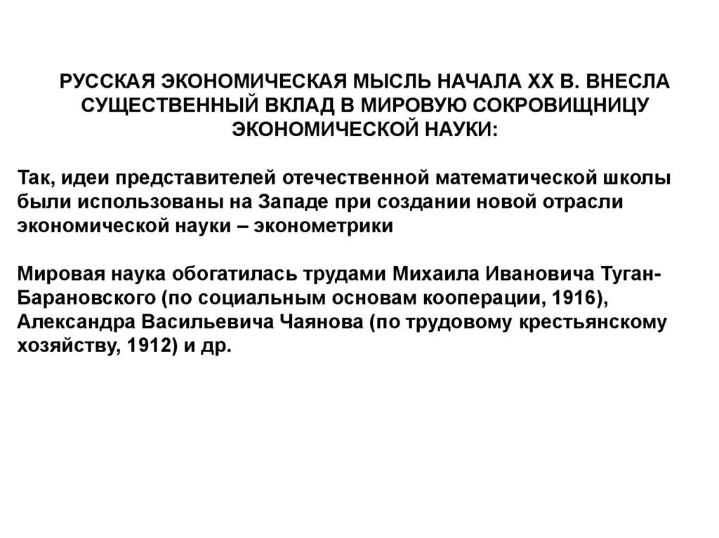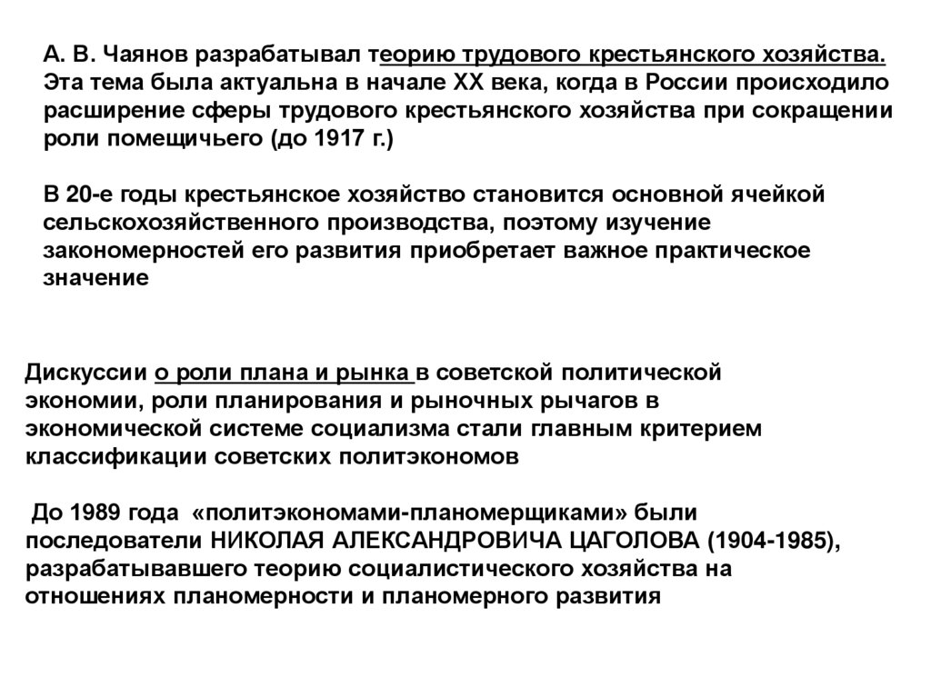 А. В. Чаянов разрабатывал теорию трудового крестьянского хозяйства.Эта тема была актуальна в начале XX века, когда в России происходило
