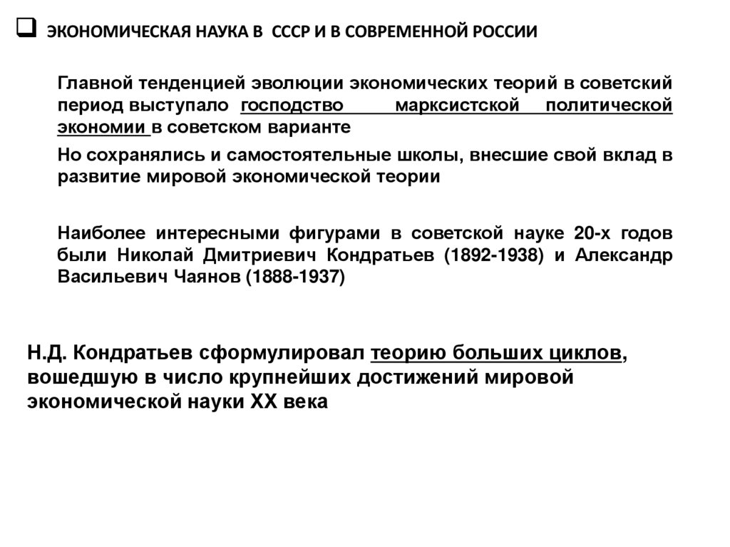 ЭКОНОМИЧЕСКАЯ НАУКА В СССР И В СОВРЕМЕННОЙ РОССИИГлавной тенденцией эволюции экономических теорий в советский