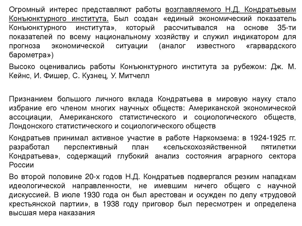 Огромный интерес представляют работы возглавляемого Н.Д. КондратьевымКонъюнктурного института. Был создан «единый экономический показатель