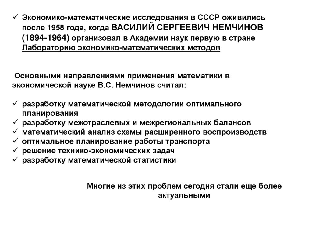 Экономико-математические исследования в СССР оживилисьпосле 1958 года, когда ВАСИЛИЙ СЕРГЕЕВИЧ НЕМЧИНОВ