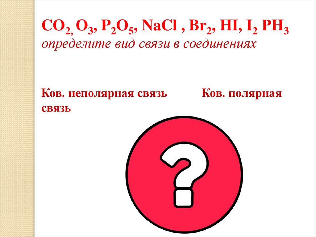 CO2, O3, P2O5, NaCl , Br2, HI, I2 РH3определите вид связи в соединениях