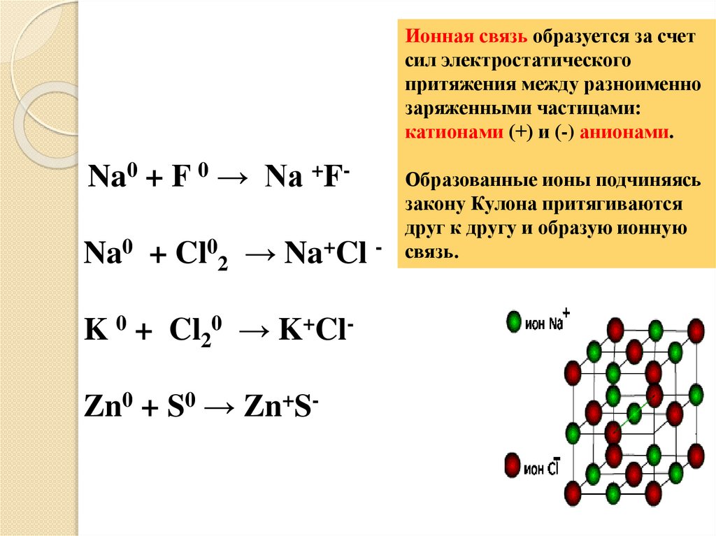 Na0 + Cl02 → Na+Cl K 0 + Cl20 → K+ClZn0 + S0 → Zn+S-