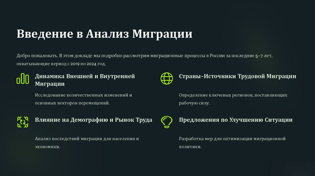 Введение в Анализ МиграцииДобро пожаловать. В этом докладе мы подробно рассмотрим миграционные процессы в России за последние 5–7 лет,