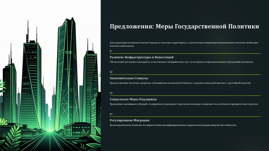 Предложения: Меры Государственной ПолитикиДля удержания молодежи в малых городах и сельских территориях, а также для регулирования миграционных потоков, необходим