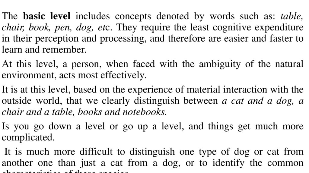 The basic level includes concepts denoted by words such as: table,chair, book, pen, dog, etc. They require the least cognitive expenditure