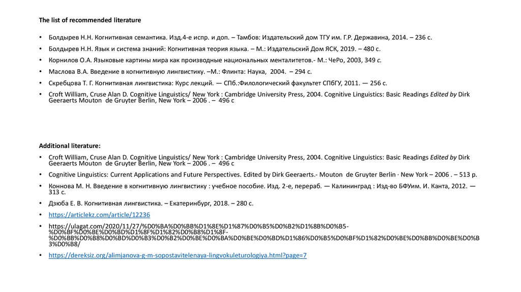 The list of recommended literatureБолдырев Н.Н. Когнитивная семантика. Изд.4-е испр. и доп. – Тамбов: Издательский дом ТГУ им. Г.Р. Державина, 2014. – 236 с.