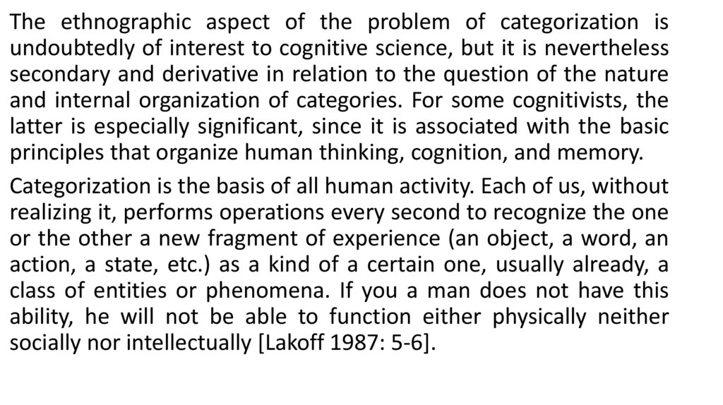 The ethnographic aspect of the problem of categorization isundoubtedly of interest to cognitive science, but it is nevertheless