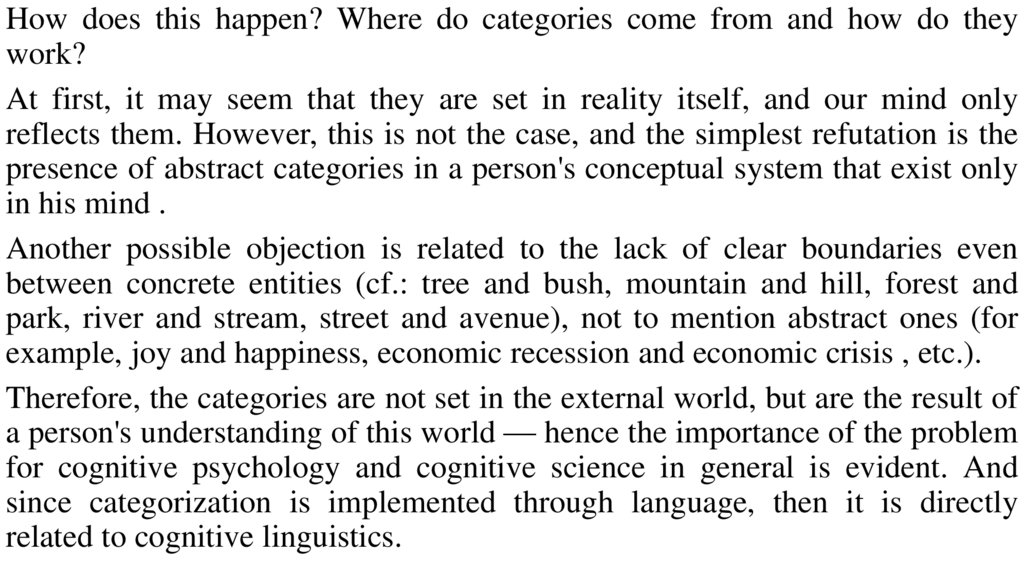 It is important to emphasize that the allocation of three main levels ofcategorization is rather conditional. Our thinking is multidimensional,